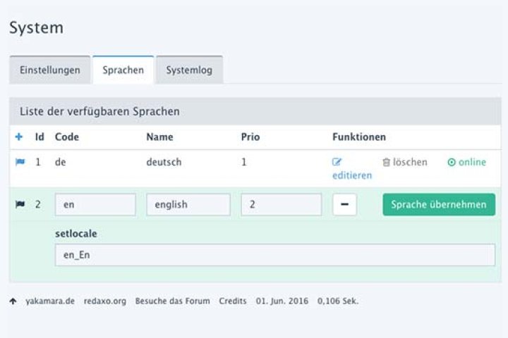 Es muss nicht bei diesen beiden Feldern bleiben. Neu hinzugekommen in REDAXO 5 sind Metafelder für Sprachen. Wie bei Kategorien, Artikeln und Medien auch stehen bei den Sprachen nun also Metafelder zur Verfügung, z.B. für sprachspezifische Einstellungen.